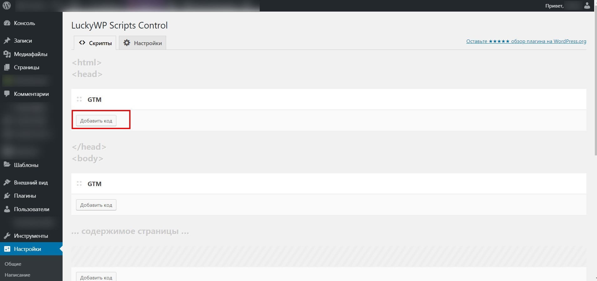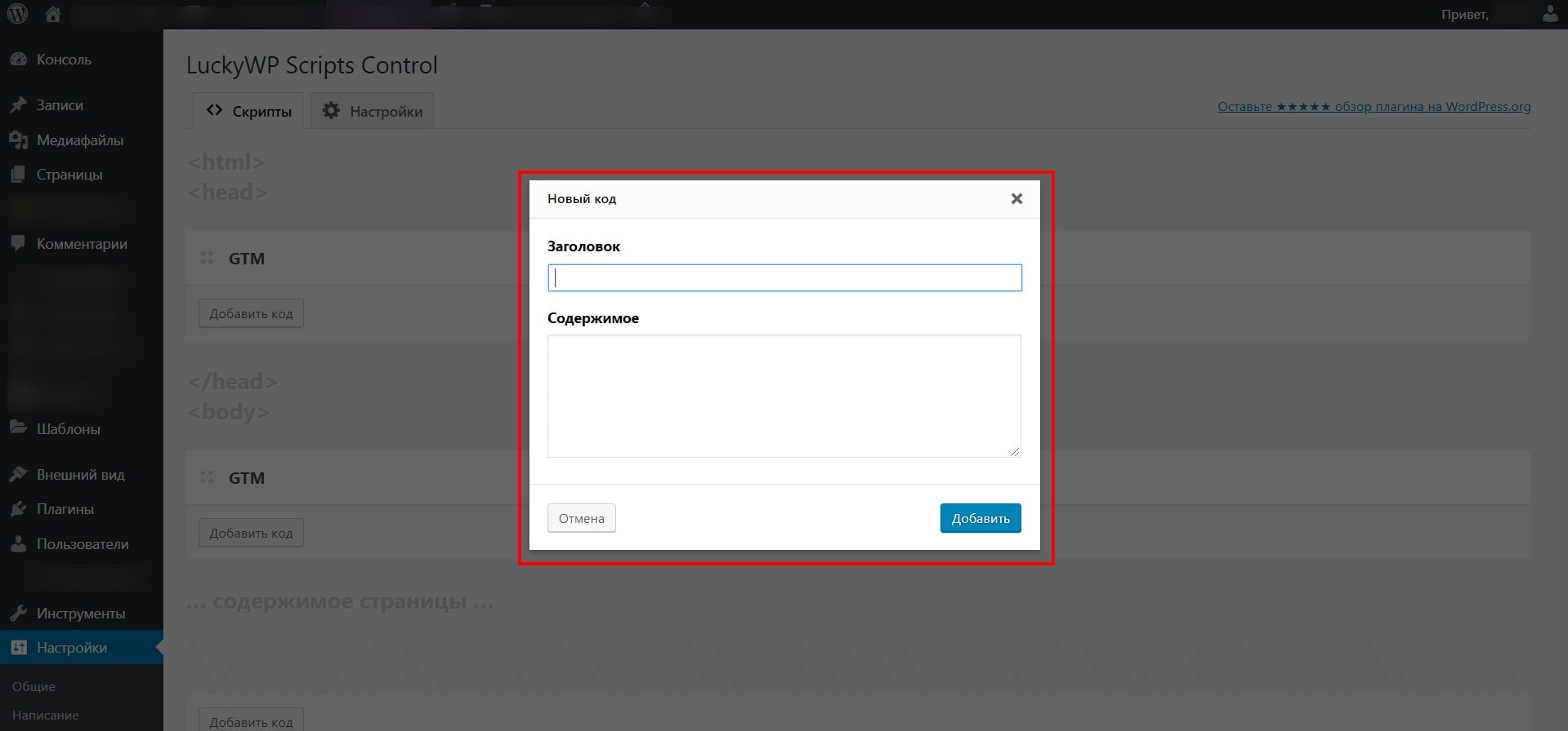 - У панелі адміністратора WordPress переходимо "Плагіни - Додати новий" і в полі пошуку вводимо назву плагіна "LuckyWP Scripts Control". Ось посилання на плагін -https://wordpress.org/plugins/luckywp-scripts-control/.Функціонал дозволяє додавати довільний код у розділи «head» і «body»