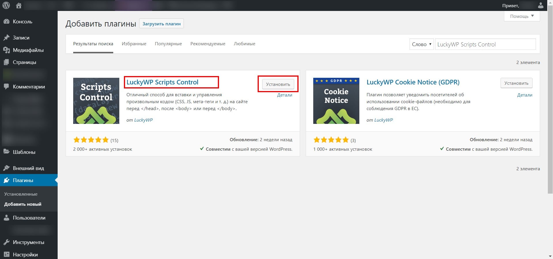 - У результатах пошуку за плагінами натискаємо кнопку «Встановити» навпроти «LuckyWP Scripts Control»